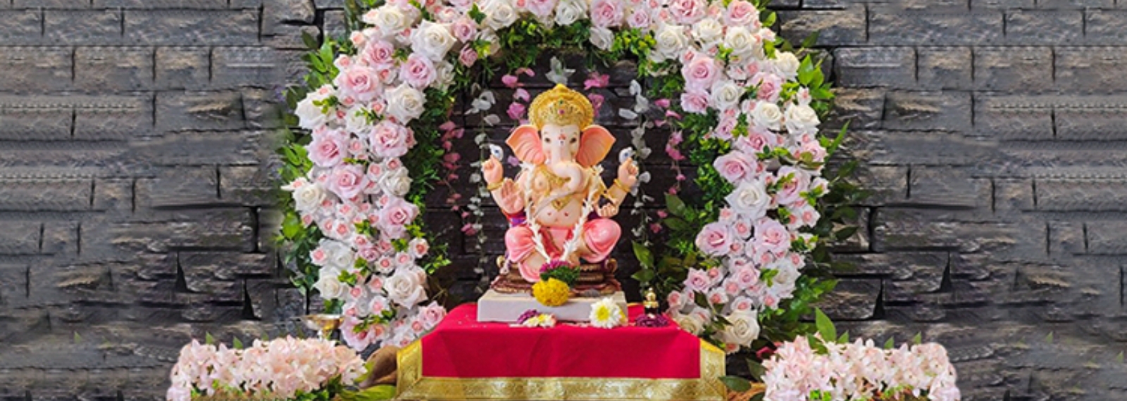 The Kalpana's Academy of Floral Designing offers A DIY Fresh Flower Decoration Workshop with Step-by-Step Instructions on the Theme ""Ganpati Flower Decoration"" Discover Trendy Ganpati Backdrop Concepts and Techniques.