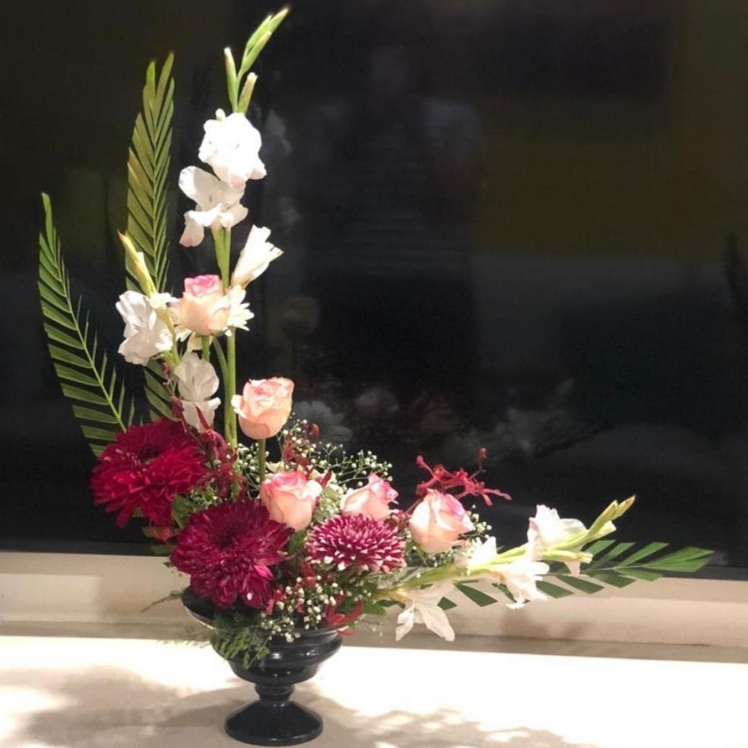 ARICA PALM, GYPSO, WHITE GLADS, JUMELIA, RED DAHLIA