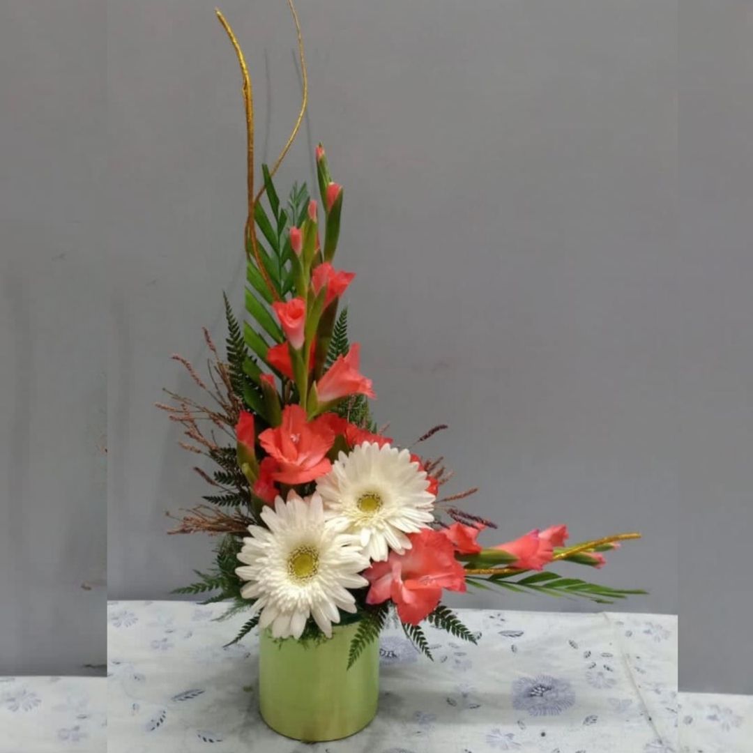 ORANGE GLADULI, WHITE GERBERA, ARICA PALM, LIMONIUM AND DRY STICKS